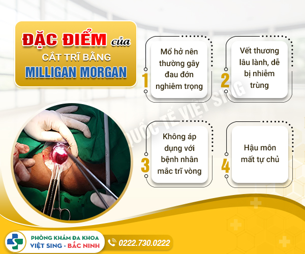Phương pháp Milligan Morgan dù hiện đang được áp dụng nhiều tại các bệnh viện ở Việt Nam, thường được chỉ định với người mắc mắc trĩ độ 3, độ 4, hỗn hợp và phức tạp. Thế nhưng, hiện phương pháp này không còn được tín nhiệm như trước bởi vì thực hiện mổ hở nên thường vết thương sau thủ thuật rất dễ bị viêm nhiễm, nhiễm trùng nên tỷ lệ tái phát bệnh sẽ cao hơn bình thường.